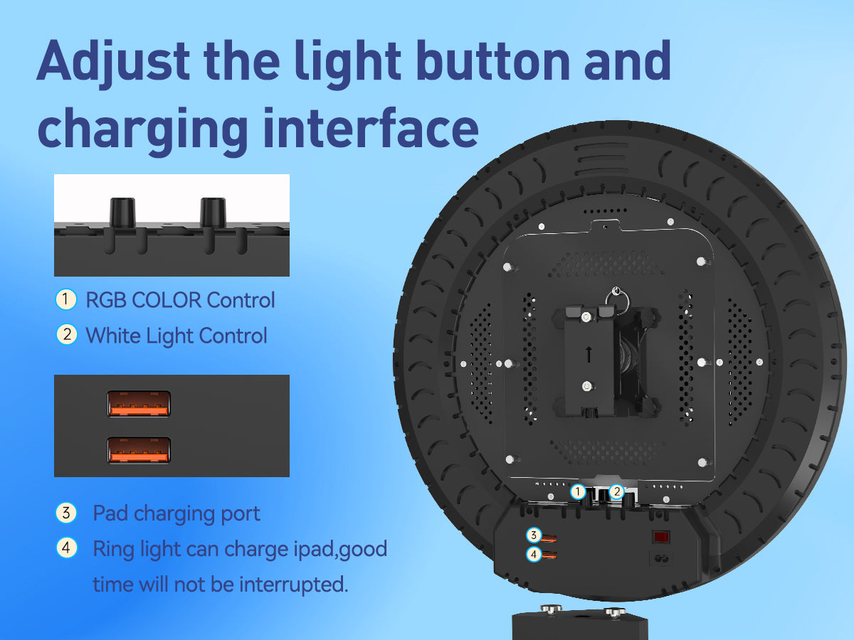 In the rear side of ring light, there are two USB ports for charging your iPad.