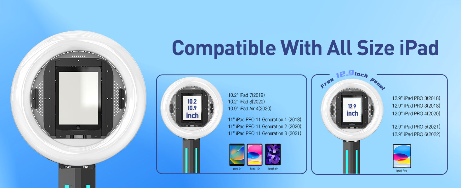 Re:Our Photo booth machine support all size of iPad,if you meet an issue that your photo booth cannot fit with your iPad,please contact us, we will send you a new front metal plate to have it fit your iPad.