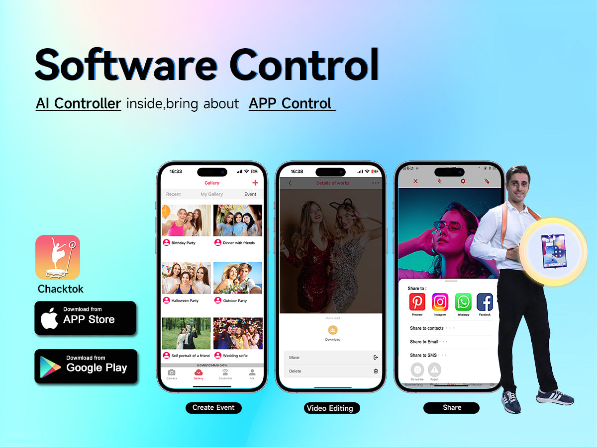Chacktok software enable you create image and video,also support adding sticker,emotion and filter,and support sharing in social media App.